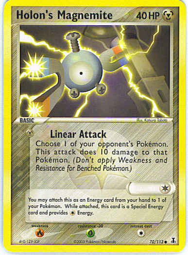 Type | Metal | Pokemon serie | Delta Species | Stadie | Basic | HP | 40 | Sjældenhed | Common | Tilbagetrækning | 1 | Modstand | G | Svaghed | F | Kortnummer | 70 | Evne | [M] Linear Attack - Choose 1 of your opponent's Pokemon. This attack does 10 damage to that Pokemon. (Don't apply Weakness and Resistance for Benched Pokemon.) You may attach this as an Energy card from your hand to 1 of your Pokemon. While attached, this card is a Special Energy card and provides 1 C Energy. | Evne2 | [M] Linear Attack - Choose 1 of your opponent's Pokemon. This attack does 10 damage to that Pokemon. (Don't apply Weakness and Resistance for Benched Pokemon.) You may attach this as an Energy card from your hand to 1 of your Pokemon. While attached, this card is a Special Energy card and provides 1 C Energy. | Kunstner | Katsura Tabata |