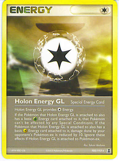 Holon Energy GL provides C Energy. If the Pokemon that Holon Energy GL is attached to also has a basic G Energy card attached to it, that Pokemon can't be affected by any Special Conditions. If the Pokemon that Holon Energy GL is attached to also has a basic L Energy card attached to it, damage done by your opponent's Pokemon-ex is reduced by 10. Ignore these effects if Holon Energy GL is attached to Pokemon-ex.