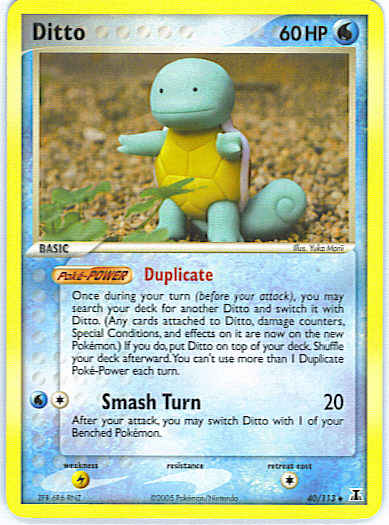 Type | Water | Pokemon serie | Delta Species | Stadie | Basic | HP | 60 | Sjældenhed | Uncommon | Tilbagetrækning | 1 | Svaghed | L | Kortnummer | 40 | Evne | on it are now on the new Pokemon.) If you do, put Ditto on top of your deck. Shuffle your deck afterward. You can't use more than 1 Duplicate Poke-Power each turn. (Poke-POWER)
