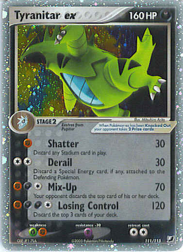 Type | Darkness | Pokemon serie | Unseen Forces | Stadie | Stage 2 | HP | 160 | Sjældenhed | Ultra-Rare | Tilbagetrækning | 2 | Modstand | P | Svaghed | GF | Kortnummer | 111 | Evne | [F] Shatter (30) Discard any Stadium card in play. [CC] Derail (30) Discard a Special Energy card, if any, attached to the Defending Pokemon. [CDF] Mix-Up (70) Your opponent discards the top card of his or her deck. | Evne2 | [F] Shatter (30) Discard any Stadium card in play. [CC] Derail (30) Discard a Special Energy card, if any, attached to the Defending Pokemon. [CDF] Mix-Up (70) Your opponent discards the top card of his or her deck. | Kunstner | Mitsuhiro Arita |