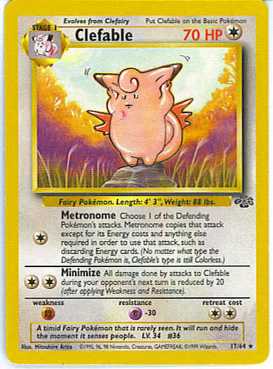 Evne [C] Metronome - Choose 1 of the Defending Pokemon's attacks. Metronome copies that attack except for its Energy costs and anything else required in order to use that attack, such as discarding Energy cards. (No matter what type the Defending Pokemon is, Clefable's type is still Colorless.)
