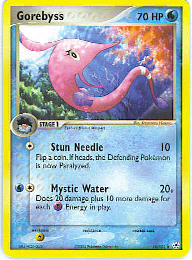 Type | Water | Pokemon serie | Hidden Legends | Stadie | Stage 1 | HP | 70 | Sjældenhed | Rare | Svaghed | L | Kortnummer | 18 | Evne | [C] Stun Needle (10) Flip a coin. If heads, the Defending Pokemon is now Paralyzed. [CW] Mystic Water (20+) Does 20 damage plus 10 more for each P Energy in play. | Evne2 | [C] Stun Needle (10) Flip a coin. If heads, the Defending Pokemon is now Paralyzed. [CW] Mystic Water (20+) Does 20 damage plus 10 more for each P Energy in play. | Kunstner | Kagemaru Himeno |