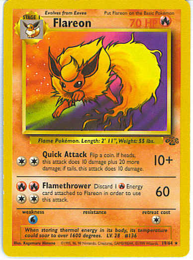 Type | Fire | Pokemon serie | Jungle | Stadie | Stage 1 | HP | 70 | Sjældenhed | Rare | Tilbagetrækning | 1 | Svaghed | W | Kortnummer | 19 | Evne |