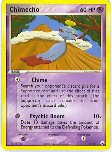 Type | Psychic | Pokemon serie | Hidden Legends | Stadie | Basic | HP | 60 | Sjældenhed | Rare | Tilbagetrækning | 1 | Svaghed | P | Kortnummer | 17 | Evne | [C] Chime - Search your opponent's discard pile for a Supporter card and use the effect of that card as the effect of this attack. (The Supporter card remains in your opponent's discard pile.) [P] Psychic Boom (10x) Does 10 damage times the amount of Energy attached to the Defending Pokemon. | Evne2 | [C] Chime - Search your opponent's discard pile for a Supporter card and use the effect of that card as the effect of this attack. (The Supporter card remains in your opponent's discard pile.) [P] Psychic Boom (10x) Does 10 damage times the amount of Energy attached to the Defending Pokemon. | Kunstner | Miki Tanaka |