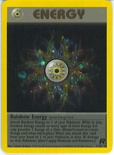 Attach Rainbow Energy to 1 of your Pokemon. While in play, Rainbow Energy counts as every type of basic Energy but only provides 1 Energy at a time. (Doesn't count as a basic Energy card when not in play.) When you attach this card from your hand to 1 of your Pokemon, it does 10 damage to that Pokemon. (Don't apply Weakness and Resistance.)