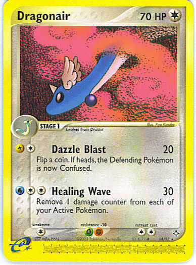 Type | Colorless | Pokemon serie | Dragon | Stadie | Stage 1 | HP | 70 | Sjældenhed | Rare | Tilbagetrækning | 2 | Modstand | FG | Svaghed | C | Kortnummer | 14 | Evne | [CL] Dazzle Blast (20) Flip a coin. If heads, the Defending Pokemon is now Confused. [CCW] Healing Wave (30) Remove 1 damage counter from each of your Active Pokemon. | Evne2 | [CL] Dazzle Blast (20) Flip a coin. If heads, the Defending Pokemon is now Confused. [CCW] Healing Wave (30) Remove 1 damage counter from each of your Active Pokemon. | Kunstner | Aya Kusube |