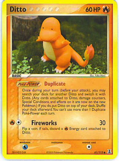 Type | Fire | Pokemon serie | Delta Species | Stadie | Basic | HP | 60 | Sjældenhed | Common | Tilbagetrækning | 1 | Svaghed | W | Kortnummer | 61 | Evne | on it are now on the new Pokemon.) If you do, put Ditto on top of your deck. Shuffle your deck afterward. You can't use more than 1 Duplicate Poke-Power each turn. (Poke-POWER)