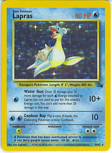 [W] Water Gun (10+) Does 10 damage plus 10 more damage for each W Energy attached to Lapras but not used to pay for this attack's Energy cost. You can't add more than 20 damage this way.