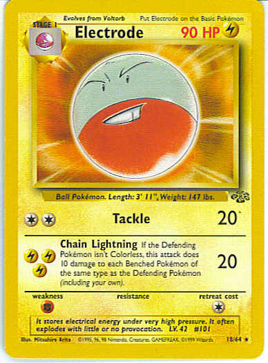 Type | Lightning | Pokemon serie | Jungle | Stadie | Stage 1 | HP | 90 | Sjældenhed | Rare | Tilbagetrækning | 1 | Svaghed | F | Kortnummer | 18 | Evne |