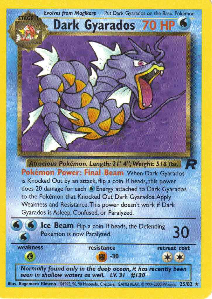 Type | Water | Pokemon serie | Team Rocket | Stadie | Stage 1 | HP | 70 | Sjældenhed | Rare | Tilbagetrækning | 2 | Modstand | F | Svaghed | G | Kortnummer | 25 | Evne |