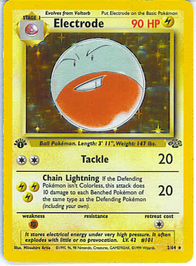 Type | Lightning | Pokemon serie | Jungle | Stadie | Stage 1 | HP | 90 | Sjældenhed | Rare | Tilbagetrækning | 1 | Svaghed | F | Kortnummer | 2 | Evne |