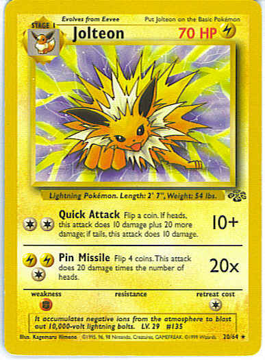 Type | Lightning | Pokemon serie | Jungle | Stadie | Stage 1 | HP | 70 | Sjældenhed | Rare | Tilbagetrækning | 1 | Svaghed | F | Kortnummer | 20 | Evne |