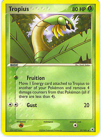 Type | Grass | Pokemon serie | Hidden Legends | Stadie | Basic | HP | 80 | Sjældenhed | Rare | Tilbagetrækning | 1 | Svaghed | R | Kortnummer | 27 | Evne | [C] Fruition - Move 1 Energy card attached to Tropius to another of your Pokemon and remove 4 damage counters from that Pokemon (all if there are less than 4). [CC] Gust (20) | Evne2 | [C] Fruition - Move 1 Energy card attached to Tropius to another of your Pokemon and remove 4 damage counters from that Pokemon (all if there are less than 4). [CC] Gust (20) | Kunstner | Kouki Saitou |