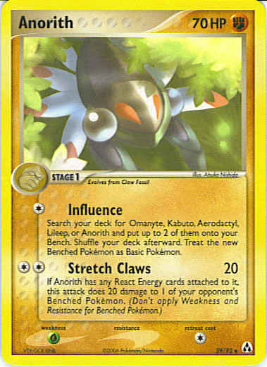 Type | Fighting | Pokemon serie | Legend Maker | Stadie | Stage 1 | HP | 70 | Sjældenhed | Uncommon | Tilbagetrækning | 1 | Svaghed | G | Kortnummer | 29 | Evne | [C] Influence - Search your deck for Omanyte, Kabuto, Aerodactyl, Lileep, or Anorith and put 2 of them onto your Bench. Shuffle your deck afterward. Treat the new Benched Pokemon as Basic Pokemon. [CC] Stretch Claws (20) If Anorith has any React Energy cards attached to it, this attack does 20 damage to 1 of your opponent's Benched Pokemon. (Don't apply Weakness and Resistance for Benched Pokemon.) | Evne2 | [C] Influence - Search your deck for Omanyte, Kabuto, Aerodactyl, Lileep, or Anorith and put 2 of them onto your Bench. Shuffle your deck afterward. Treat the new Benched Pokemon as Basic Pokemon. [CC] Stretch Claws (20) If Anorith has any React Energy cards attached to it, this attack does 20 damage to 1 of your opponent's Benched Pokemon. (Don't apply Weakness and Resistance for Benched Pokemon.) | Kunstner | Atsuko Nishida |