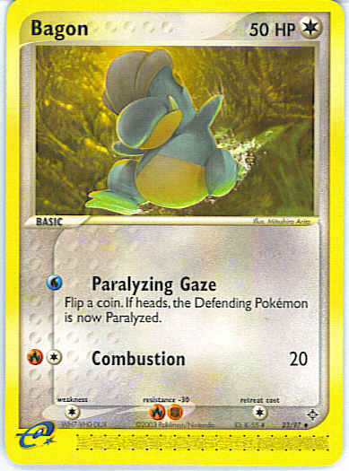 Type | Colorless | Pokemon serie | Dragon | Stadie | Basic | HP | 50 | Sjældenhed | Uncommon | Tilbagetrækning | 1 | Modstand | FR | Svaghed | C | Kortnummer | 23 | Evne | [W] Paralyzing Gaze - Flip a coin. If heads, the Defending Pokemon is now Paralyzed. [CR] Combustion (20) | Evne2 | [W] Paralyzing Gaze - Flip a coin. If heads, the Defending Pokemon is now Paralyzed. [CR] Combustion (20) | Kunstner | Mitsuhiro Arita |