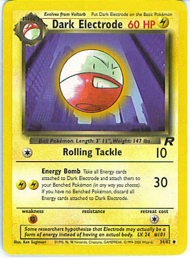Type | Lightning | Pokemon serie | Team Rocket | Stadie | Stage 1 | HP | 60 | Sjældenhed | Uncommon | Tilbagetrækning | 1 | Svaghed | F | Kortnummer | 34 | Evne |