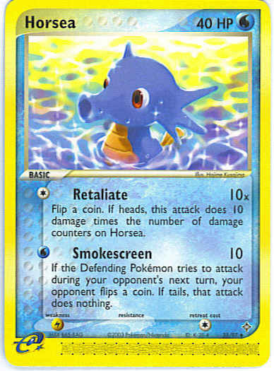 Type | Water | Pokemon serie | Dragon | Stadie | Basic | HP | 40 | Sjældenhed | Uncommon | Tilbagetrækning | 1 | Svaghed | L | Kortnummer | 33 | Evne | [C] Retaliate (10x) Flip a coin. If heads, this attack does 10 damage times the number of damage counters on Horsea. [W] Smokescreen (10) If the Defending Pokemon tries to attack during your opponent's next turn, your opponent flips a coin. If tails, that attack does nothing. | Evne2 | [C] Retaliate (10x) Flip a coin. If heads, this attack does 10 damage times the number of damage counters on Horsea. [W] Smokescreen (10) If the Defending Pokemon tries to attack during your opponent's next turn, your opponent flips a coin. If tails, that attack does nothing. | Kunstner | Hajime Kusajima |