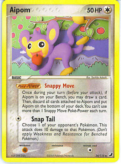 Type | Colorless | Pokemon serie | Unseen Forces | Stadie | Basic | HP | 50 | Sjældenhed | Uncommon | Tilbagetrækning | 1 | Svaghed | F | Kortnummer | 34 | Evne | [C] Snap Tail - Choose 1 of your opponent's Pokemon. This attack does 10 damage to that Pokemon. (Don't apply Weakness and Resistance for Benched Pokemon.) | Evne2 | [C] Snap Tail - Choose 1 of your opponent's Pokemon. This attack does 10 damage to that Pokemon. (Don't apply Weakness and Resistance for Benched Pokemon.) | Kunstner | Sachiko Adachi |