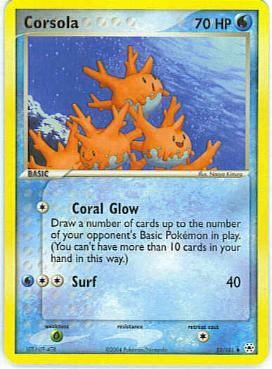 Type | Water | Pokemon serie | Hidden Legends | Stadie | Basic | HP | 70 | Sjældenhed | Uncommon | Tilbagetrækning | 1 | Svaghed | G | Kortnummer | 32 | Evne | [C] Coral Glow - Draw a number of cards up to the number of your opponent's Basic Pokemon in play. (You can't have more than 10 cards in your hand in this way.) | Evne2 | [C] Coral Glow - Draw a number of cards up to the number of your opponent's Basic Pokemon in play. (You can't have more than 10 cards in your hand in this way.) | Kunstner | Naoyo Kimura |