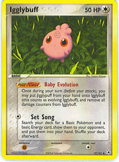 Type | Colorless | Pokemon serie | Hidden Legends | Stadie | Basic | HP | 50 | Sjældenhed | Uncommon | Tilbagetrækning | 1 | Svaghed | F | Kortnummer | 37 | Evne | [C] Set Song - Search your deck for a Basic Pokemon and a basic Energy card, show them to your opponent, and put them into your hand. Shuffle your deck afterward. | Evne2 | [C] Set Song - Search your deck for a Basic Pokemon and a basic Energy card, show them to your opponent, and put them into your hand. Shuffle your deck afterward. | Kunstner | Naoyo Kimura |
