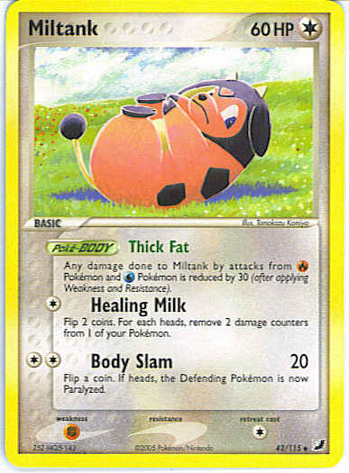 Type | Colorless | Pokemon serie | Unseen Forces | Stadie | Basic | HP | 60 | Sjældenhed | Uncommon | Tilbagetrækning | 1 | Svaghed | F | Kortnummer | 42 | Evne | [C] Healing Milk - Flip 2 coins. For each heads, remove 2 damage counters from 1 of your Pokemon. [CC] Body Slam (20) Flip a coin. If heads, the Defending Pokemon is now Paralyzed. | Evne2 | [C] Healing Milk - Flip 2 coins. For each heads, remove 2 damage counters from 1 of your Pokemon. [CC] Body Slam (20) Flip a coin. If heads, the Defending Pokemon is now Paralyzed. | Kunstner | Tomokazu Komiya |