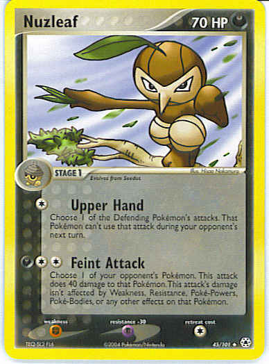 Type | Darkness | Pokemon serie | Hidden Legends | Stadie | Stage 1 | HP | 70 | Sjældenhed | Uncommon | Tilbagetrækning | 1 | Modstand | P | Svaghed | F | Kortnummer | 45 | Evne | [C] Upper Hand - Choose 1 of the Defending Pokemon's attacks. That Pokemon can't use that attack during your opponent's next turn. [CCD] Feint Attack - Choose 1 of your opponent's Pokemon. This attack does 40 damage to that Pokemon. This attack's damage isn't affected by Weakness, Resistance, Poke-Powers, Poke-Bodies, or any other effects on that Pokemon. | Evne2 | [C] Upper Hand - Choose 1 of the Defending Pokemon's attacks. That Pokemon can't use that attack during your opponent's next turn. [CCD] Feint Attack - Choose 1 of your opponent's Pokemon. This attack does 40 damage to that Pokemon. This attack's damage isn't affected by Weakness, Resistance, Poke-Powers, Poke-Bodies, or any other effects on that Pokemon. | Kunstner | Hisao Nakamura |