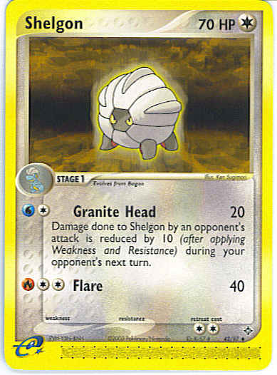 Type | Colorless | Pokemon serie | Dragon | Stadie | Stage 1 | HP | 70 | Sjældenhed | Uncommon | Tilbagetrækning | 2 | Kortnummer | 42 | Evne | [CW] Granite Head (20) Damage done to Shelgon by an opponent's attack is reduced by 10 (after applying Weakness and Resistance) during your opponent's next turn. [CCR] Flare (40) | Evne2 | [CW] Granite Head (20) Damage done to Shelgon by an opponent's attack is reduced by 10 (after applying Weakness and Resistance) during your opponent's next turn. [CCR] Flare (40) | Kunstner | Ken Sugimori |