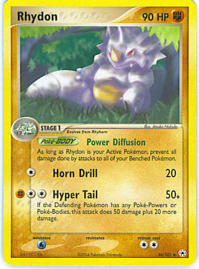 Type | Fighting | Pokemon serie | Hidden Legends | Stadie | Stage 1 | HP | 90 | Sjældenhed | Uncommon | Tilbagetrækning | 2 | Svaghed | W | Kortnummer | 46 | Evne | [C] Horn Drill (20) [CCF] Hyper Tail (50+) If the Defending Pokemon has any Poke-Powers or Poke-Bodies, this attack does 50 damage plus 20 more damage. | Evne2 | [C] Horn Drill (20) [CCF] Hyper Tail (50+) If the Defending Pokemon has any Poke-Powers or Poke-Bodies, this attack does 50 damage plus 20 more damage. | Kunstner | Atsuko Nishida |