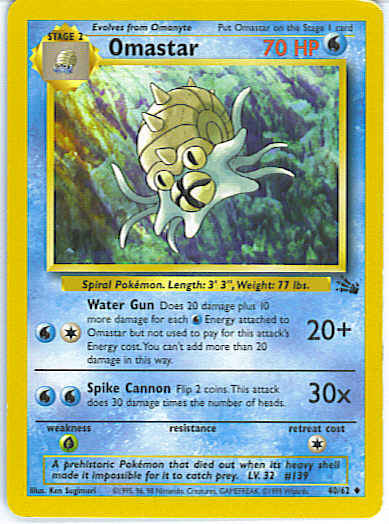 Type | Water | Pokemon serie | Fossil | Stadie | Stage 2 | HP | 70 | Sjældenhed | Uncommon | Tilbagetrækning | 1 | Svaghed | G | Kortnummer | 40 | Evne |