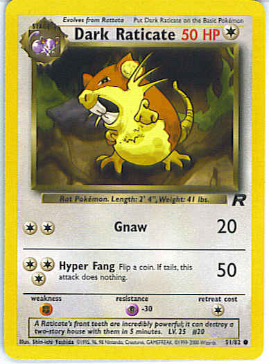 Type | Colorless | Pokemon serie | Team Rocket | Stadie | Stage 1 | HP | 50 | Sjældenhed | Common | Tilbagetrækning | 1 | Modstand | P | Svaghed | F | Kortnummer | 51 | Evne |