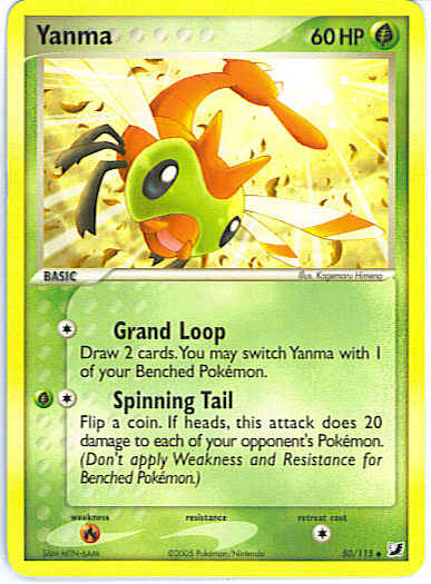 Type | Grass | Pokemon serie | Unseen Forces | Stadie | Basic | HP | 60 | Sjældenhed | Uncommon | Tilbagetrækning | 1 | Svaghed | R | Kortnummer | 50 | Evne | [C] Grand Loop - Draw 2 cards. You may switch Yanma with 1 of your Benched Pokemon. [CG] Spinning Tail - Flip a coin. If heads, this attack does 20 damage to each of your opponent's Pokemon. (Don't apply Weakness and Resistance for Benched Pokemon.) | Evne2 | [C] Grand Loop - Draw 2 cards. You may switch Yanma with 1 of your Benched Pokemon. [CG] Spinning Tail - Flip a coin. If heads, this attack does 20 damage to each of your opponent's Pokemon. (Don't apply Weakness and Resistance for Benched Pokemon.) | Kunstner | Kagemaru Himeno |