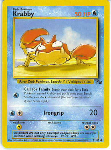 [W] Call for Family - Search your deck for a Basic Pokemon named Krabby and put it onto your Bench. Shuffle your deck afterward. (You can't use this attack if your Bench is full.)