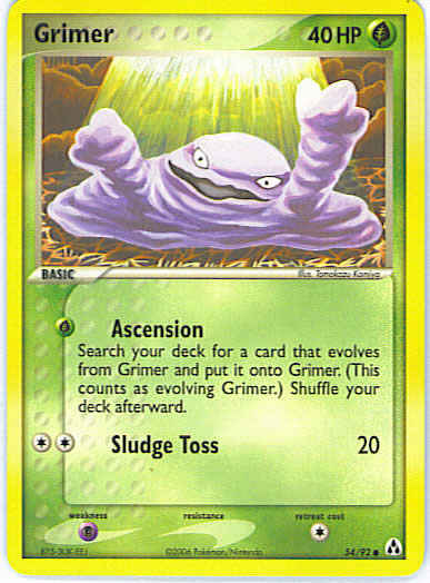 Type | Grass | Pokemon serie | Legend Maker | Stadie | Basic | HP | 40 | Sjældenhed | Common | Tilbagetrækning | 1 | Svaghed | P | Kortnummer | 54 | Evne | [G] Ascension - Search you deck for a card that evolves from Grimer and put it onto Grimer. (This counts as evolving Grimer). Shuffle your deck afterward. [CC] Sludge Toss (20) | Evne2 | [G] Ascension - Search you deck for a card that evolves from Grimer and put it onto Grimer. (This counts as evolving Grimer). Shuffle your deck afterward. [CC] Sludge Toss (20) | Kunstner | Tomokazu Komiya |
