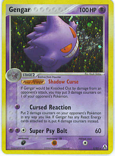 Evne [P] Cursed Reaction - Put 2 damage counters on your opponent's Pokemon in any way you like. If Gengar has any React Energy attached to it, put 4 damage counters instead.