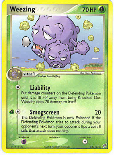 Type | Grass | Pokemon serie | Deoxys | Stadie | Stage 1 | HP | 70 | Sjældenhed | Uncommon | Tilbagetrækning | 1 | Svaghed | P | Kortnummer | 51 | Evne | [C] Liability - Put damage counters on the Defending Pokemon until it is 10 HP away from being Knocked Out. Weezing does 70 damage to itself. [CG] Smogscreen (20) The Defending Pokemon is now Poisoned. If the Defending Pokemon tries to attack during your opponent's next turn, your opponent flips a coin. If tails, that attack does nothing. | Evne2 | [C] Liability - Put damage counters on the Defending Pokemon until it is 10 HP away from being Knocked Out. Weezing does 70 damage to itself. [CG] Smogscreen (20) The Defending Pokemon is now Poisoned. If the Defending Pokemon tries to attack during your opponent's next turn, your opponent flips a coin. If tails, that attack does nothing. | Kunstner | Hisao Nakamura |