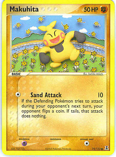 Type | Fighting | Pokemon serie | Delta Species | Stadie | Basic | HP | 50 | Sjældenhed | Common | Tilbagetrækning | 1 | Svaghed | P | Kortnummer | 75 | Evne | [C] Sand Attack (10) If the Defending Pokemon tries to attack during your opponent's next turn, your opponent flips a coin. If tails, that attack does nothing. | Evne2 | [C] Sand Attack (10) If the Defending Pokemon tries to attack during your opponent's next turn, your opponent flips a coin. If tails, that attack does nothing. | Kunstner | Sachiko Adachi |