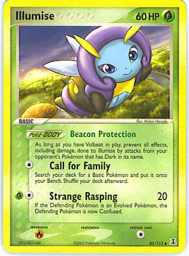 Type | Grass | Pokemon serie | Delta Species | Stadie | Basic | HP | 60 | Sjældenhed | Uncommon | Tilbagetrækning | 1 | Svaghed | R | Kortnummer | 45 | Evne | , including damage, done to Illumise by attacks from your opponent's Pokemon that has Dark in its name. (Poke-BODY)