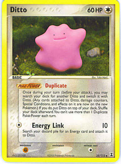 Type | Colorless | Pokemon serie | Delta Species | Stadie | Basic | HP | 60 | Sjældenhed | Uncommon | Tilbagetrækning | 1 | Svaghed | F | Kortnummer | 35 | Evne | on it are now on the new Pokemon.) If you do, put Ditto on top of your deck. Shuffle your deck afterward. You can't use more than 1 Duplicate Poke-Power each turn. (Poke-POWER)