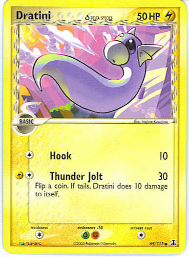Type | Lightning | Pokemon serie | Delta Species | Stadie | Basic | HP | 50 | Sjældenhed | Common | Tilbagetrækning | 1 | Modstand | FG | Svaghed | C | Kortnummer | 65 | Evne | [C] Hook (10) [CL] Thunder Jolt (30) Flip a coin. If tails, Dratini does 10 damage to itself. | Evne2 | [C] Hook (10) [CL] Thunder Jolt (30) Flip a coin. If tails, Dratini does 10 damage to itself. | Kunstner | Hajime Kusajima |