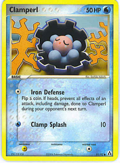 Type | Water | Pokemon serie | Legend Maker | Stadie | Basic | HP | 50 | Sjældenhed | Common | Tilbagetrækning | 1 | Svaghed | L | Kortnummer | 51 | Evne | [C] Iron Defense - Flip a coin. If heads, prevent all effects of an attack, including damage, done to Clamperl during your opponent's next turn. [W] Clamp Splash (10) | Evne2 | [C] Iron Defense - Flip a coin. If heads, prevent all effects of an attack, including damage, done to Clamperl during your opponent's next turn. [W] Clamp Splash (10) | Kunstner | Sachiko Adachi |
