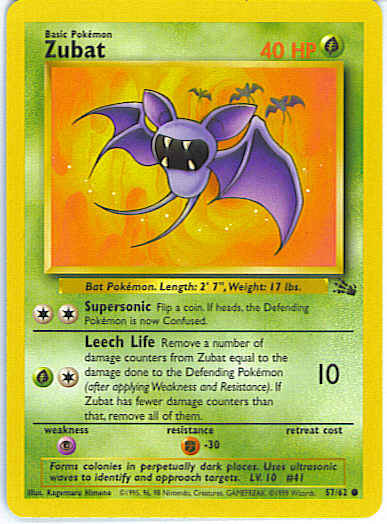 [CG] Leech Life (10) Remove a number of damage counters from Zubat equal to the damage done to the Defending Pokemon (after applying Weakness and Resistance). If Zubat has fewer damage counters than that, remove all of them.