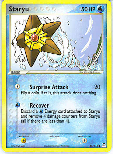 Type | Water | Pokemon serie | Delta Species | Stadie | Basic | HP | 50 | Sjældenhed | Common | Tilbagetrækning | 1 | Svaghed | L | Kortnummer | 85 | Evne | [C] Surprise Attack (20) Flip a coin. If tails, this attack does nothing. [W] Recover - Discard a W Energy card attached to Staryu and remove 4 damage counters from Staryu (all if there are less than 4). | Evne2 | [C] Surprise Attack (20) Flip a coin. If tails, this attack does nothing. [W] Recover - Discard a W Energy card attached to Staryu and remove 4 damage counters from Staryu (all if there are less than 4). | Kunstner | Hisao Nakamura |