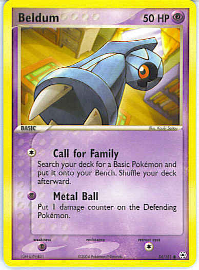Type | Psychic | Pokemon serie | Hidden Legends | Stadie | Basic | HP | 50 | Sjældenhed | Common | Tilbagetrækning | 1 | Svaghed | P | Kortnummer | 54 | Evne | [C] Call for Family - Search your deck for a Basic Pokemon and put it onto your Bench. Shuffle your deck afterward. [P] Metal Ball - Put 1 damage counter on the Defending Pokemon. | Evne2 | [C] Call for Family - Search your deck for a Basic Pokemon and put it onto your Bench. Shuffle your deck afterward. [P] Metal Ball - Put 1 damage counter on the Defending Pokemon. | Kunstner | Kouki Saitou |