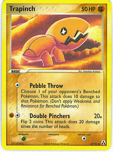 Type | Fighting | Pokemon serie | Legend Maker | Stadie | Basic | HP | 50 | Sjældenhed | Common | Tilbagetrækning | 1 | Svaghed | G | Kortnummer | 67 | Evne | [C] Pebble Throw - Choose 1 of your opponent's Benched Pokemon. This attack does 10 damage to that Pokemon. (Don't apply Weakness and Resistance for Benched Pokemon.) [CF] Double Pinchers (20x) Flip 2 coins. This attack does 2 damage times the number of heads. | Evne2 | [C] Pebble Throw - Choose 1 of your opponent's Benched Pokemon. This attack does 10 damage to that Pokemon. (Don't apply Weakness and Resistance for Benched Pokemon.) [CF] Double Pinchers (20x) Flip 2 coins. This attack does 2 damage times the number of heads. | Kunstner | Tomokazu Komiya |