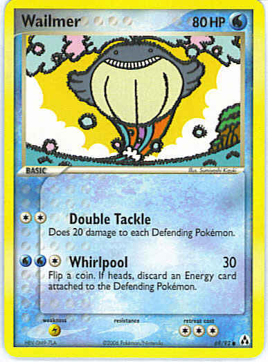 Type | Water | Pokemon serie | Legend Maker | Stadie | Basic | HP | 80 | Sjældenhed | Common | Tilbagetrækning | 3 | Svaghed | L | Kortnummer | 69 | Evne | [CC] Double Tackle - Does 20 damage to each Defending Pokemon. [CWW] Whirlpool (30) Flip a coin. If heads, discard an Energy card attached to the Defending Pokemon. | Evne2 | [CC] Double Tackle - Does 20 damage to each Defending Pokemon. [CWW] Whirlpool (30) Flip a coin. If heads, discard an Energy card attached to the Defending Pokemon. | Kunstner | Sumiyoshi Kizuki |