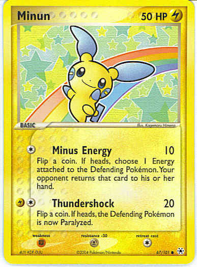 Type | Lightning | Pokemon serie | Hidden Legends | Stadie | Basic | HP | 50 | Sjældenhed | Common | Tilbagetrækning | 1 | Modstand | M | Svaghed | F | Kortnummer | 67 | Evne | [C] Minus Energy (10) Flip a coin. If heads, choose 1 Energy attached to the Defending Pokemon. Your opponent returns that card to his or her hand. [CL] Thundershock (20) Flip a coin. If heads, the Defending Pokemon is now Paralyzed. | Evne2 | [C] Minus Energy (10) Flip a coin. If heads, choose 1 Energy attached to the Defending Pokemon. Your opponent returns that card to his or her hand. [CL] Thundershock (20) Flip a coin. If heads, the Defending Pokemon is now Paralyzed. | Kunstner | Kagemaru Himeno |
