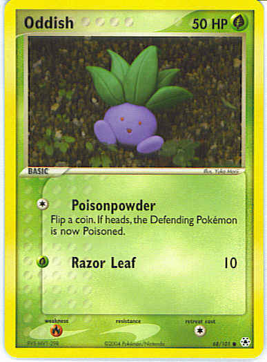 Type | Grass | Pokemon serie | Hidden Legends | Stadie | Basic | HP | 50 | Sjældenhed | Common | Tilbagetrækning | 1 | Svaghed | R | Kortnummer | 68 | Evne | [C] Poisonpowder - Flip a coin. If heads, the Defending Pokemon is now Poisoned. [G] Razor Leaf (10) | Evne2 | [C] Poisonpowder - Flip a coin. If heads, the Defending Pokemon is now Poisoned. [G] Razor Leaf (10) | Kunstner | Yuka Morii |