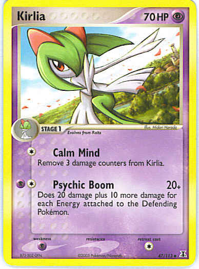 Type | Psychic | Pokemon serie | Delta Species | Stadie | Stage 1 | HP | 70 | Sjældenhed | Uncommon | Tilbagetrækning | 1 | Svaghed | P | Kortnummer | 47 | Evne | [C] Calm Mind - Remove 3 damage counters from Kirlia. [CP] Psychic Boom (20+) Does 20 damage plus 10 more damage for each Energy attached to the Defending Pokemon. | Evne2 | [C] Calm Mind - Remove 3 damage counters from Kirlia. [CP] Psychic Boom (20+) Does 20 damage plus 10 more damage for each Energy attached to the Defending Pokemon. | Kunstner | Midori Harada |
