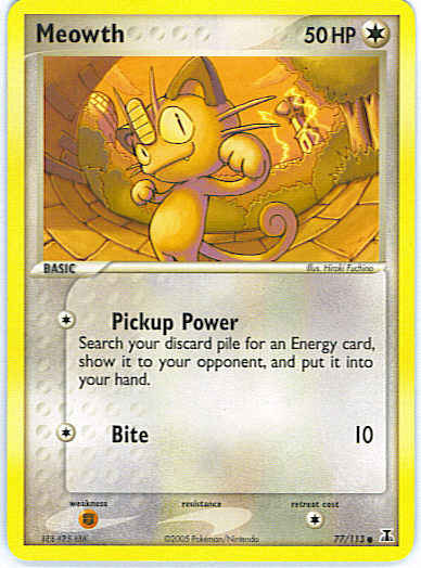 Type | Colorless | Pokemon serie | Delta Species | Stadie | Basic | HP | 50 | Sjældenhed | Common | Tilbagetrækning | 1 | Svaghed | F | Kortnummer | 77 | Evne | [C] Pickup Power - Search your discard pile for an Energy card, show it to your opponent, and put it into your hand. [C] Bite (10) | Evne2 | [C] Pickup Power - Search your discard pile for an Energy card, show it to your opponent, and put it into your hand. [C] Bite (10) | Kunstner | Hiroki Fuchino |