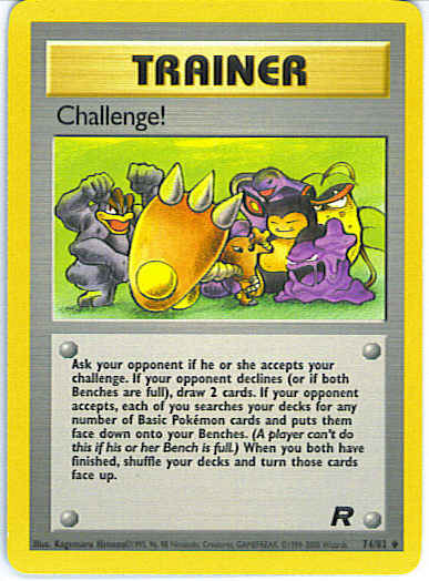 Ask your opponent if he or she accepts your challenge. If your opponent declines (or if both Benches are full), draw 2 cards. If your opponent accepts, each of you searches your decks for any number of Basic Pokemon cards and puts them face down onto your Benches. (A player can't do this if his or her Bench is full.) When you both have finished, shuffle your decks and turn those cards face up.